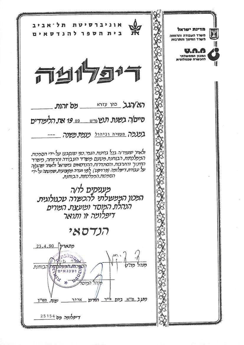 1987 – בוגר הנדסאי תעשייה וניהול.